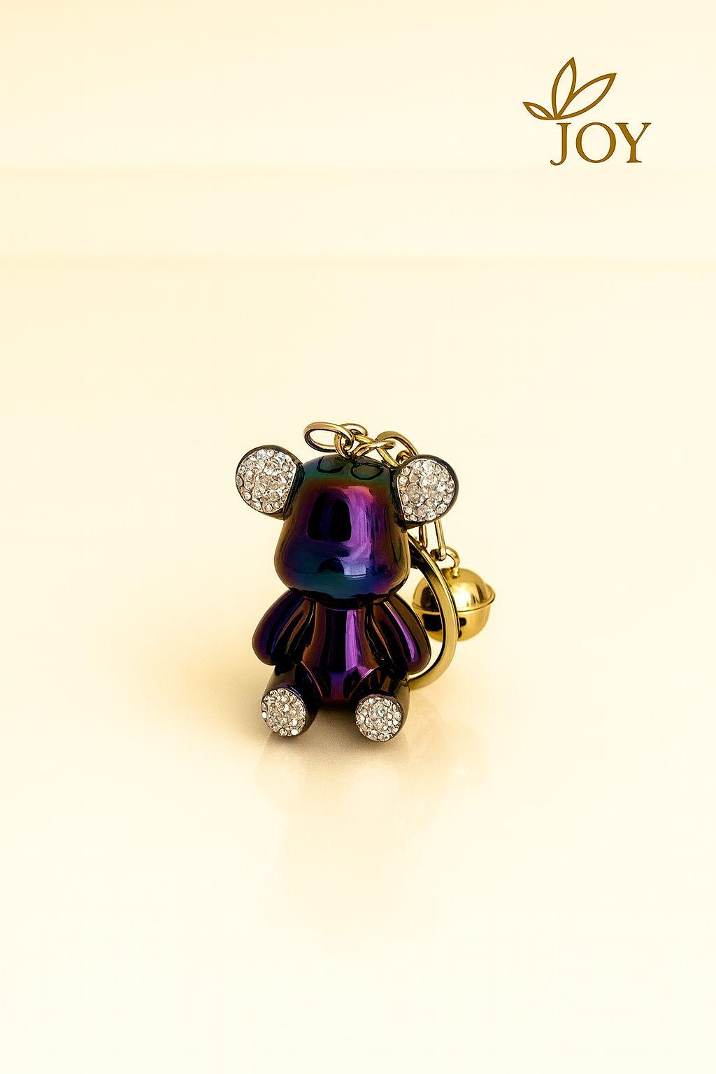 : An iridescent crystal bear keychain with a unique gradient of purple and green, finished with a metallic shine. Embellished with sparkling rhinestones on the ears and paws, this piece adds a bold and stylish touch to your look