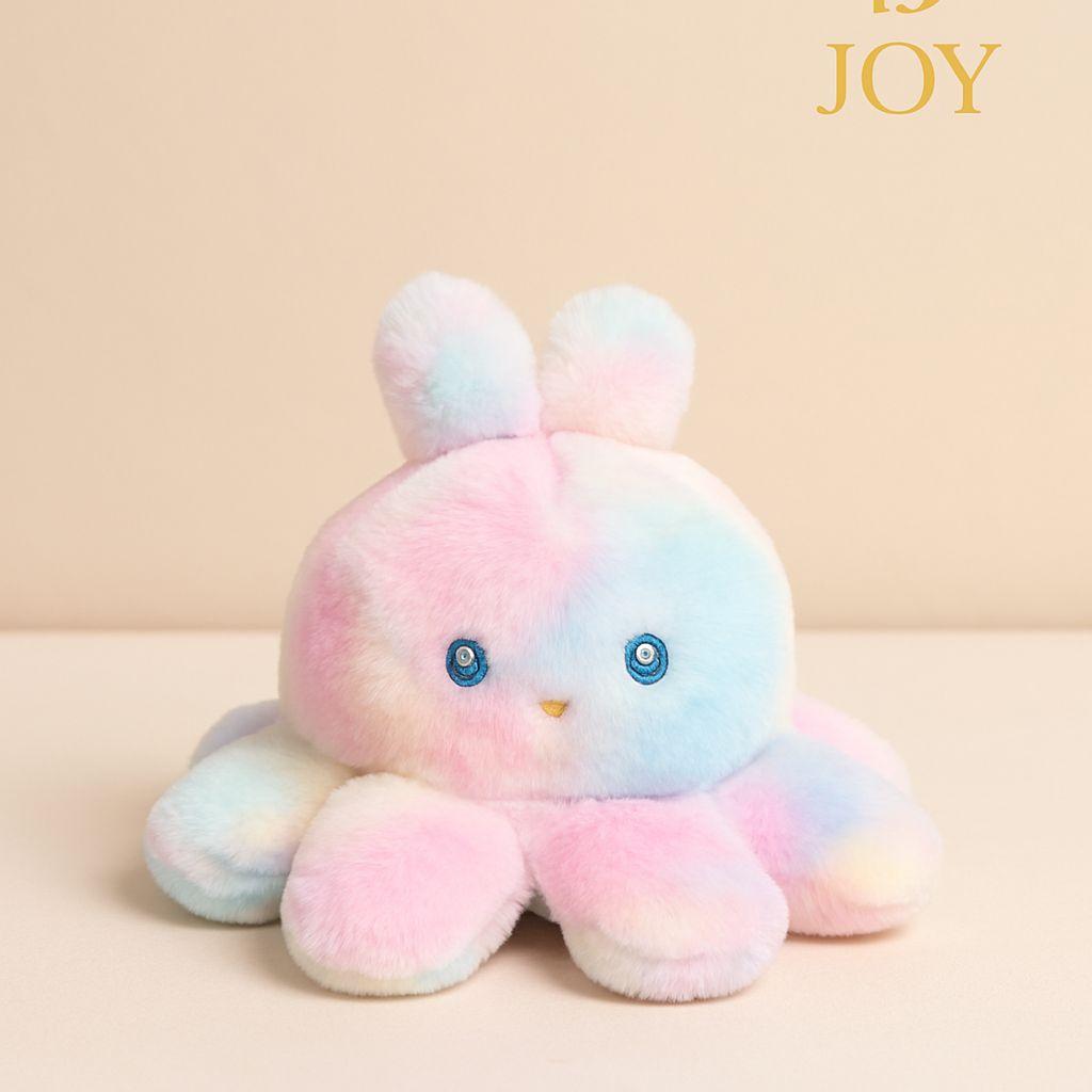 : A plush toy shaped like an octopus in pastel pink, sky blue, and lavender, with a cute design that spreads joy and is loved by kids .