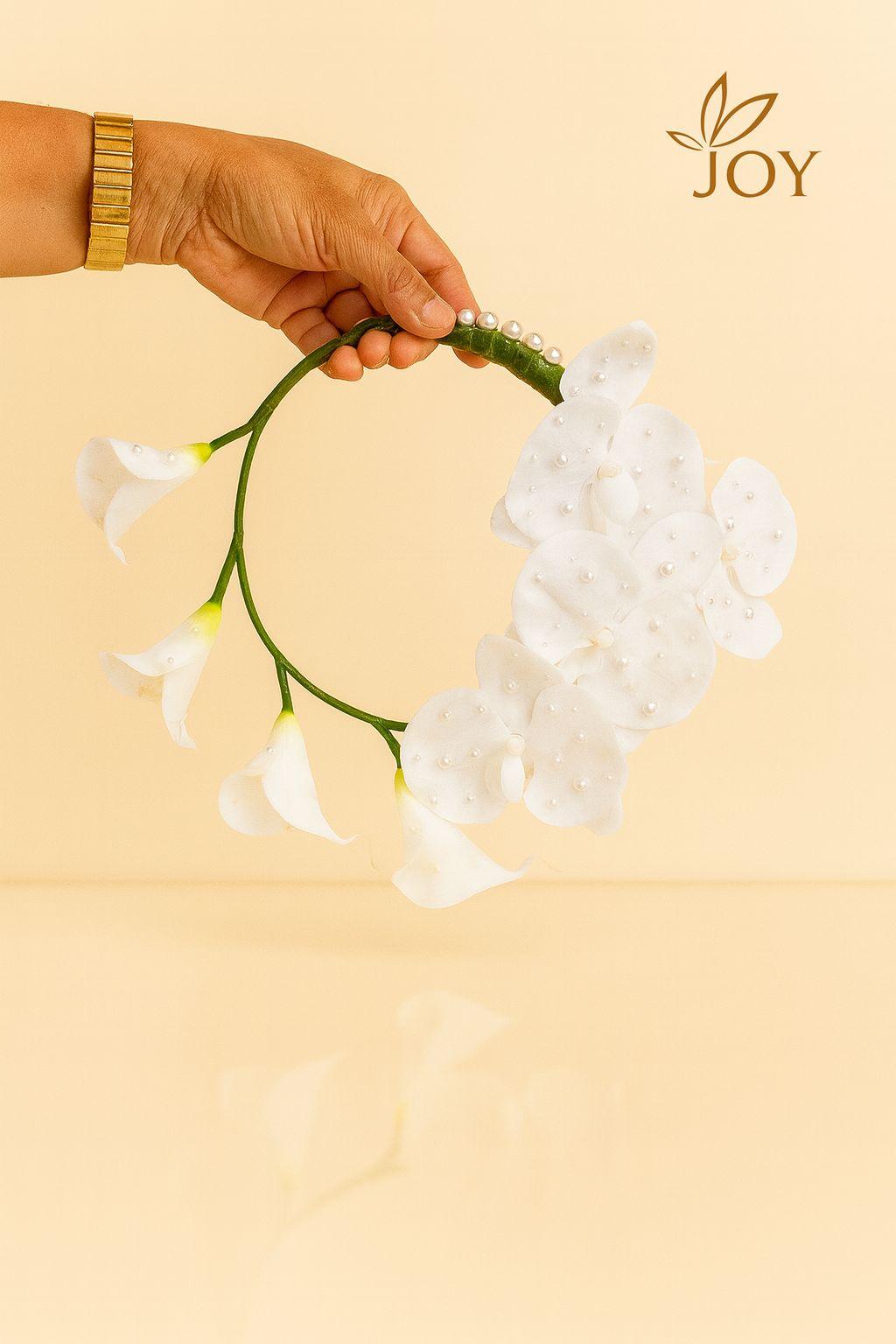 A graceful fusion of timeless elegance – delicate white orchids adorned with pearls, paired with soft calla lilies for a bouquet that radiates