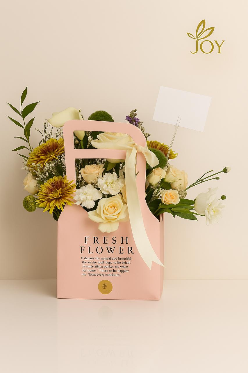 : Fresh Flower Bag : An elegant arrangement inside a soft pink flower bag, adorned with a creamy satin ribbon. It features a fresh selection of natural flowers in calming shades of white and yellow, complemented with greenery. A modern and chic design, perfect for everyday gifting and special occasions . Flowers Used: White roses, yellow roses, green chrysanthemums, yellow chrysanthemums, assorted seasonal flowers .