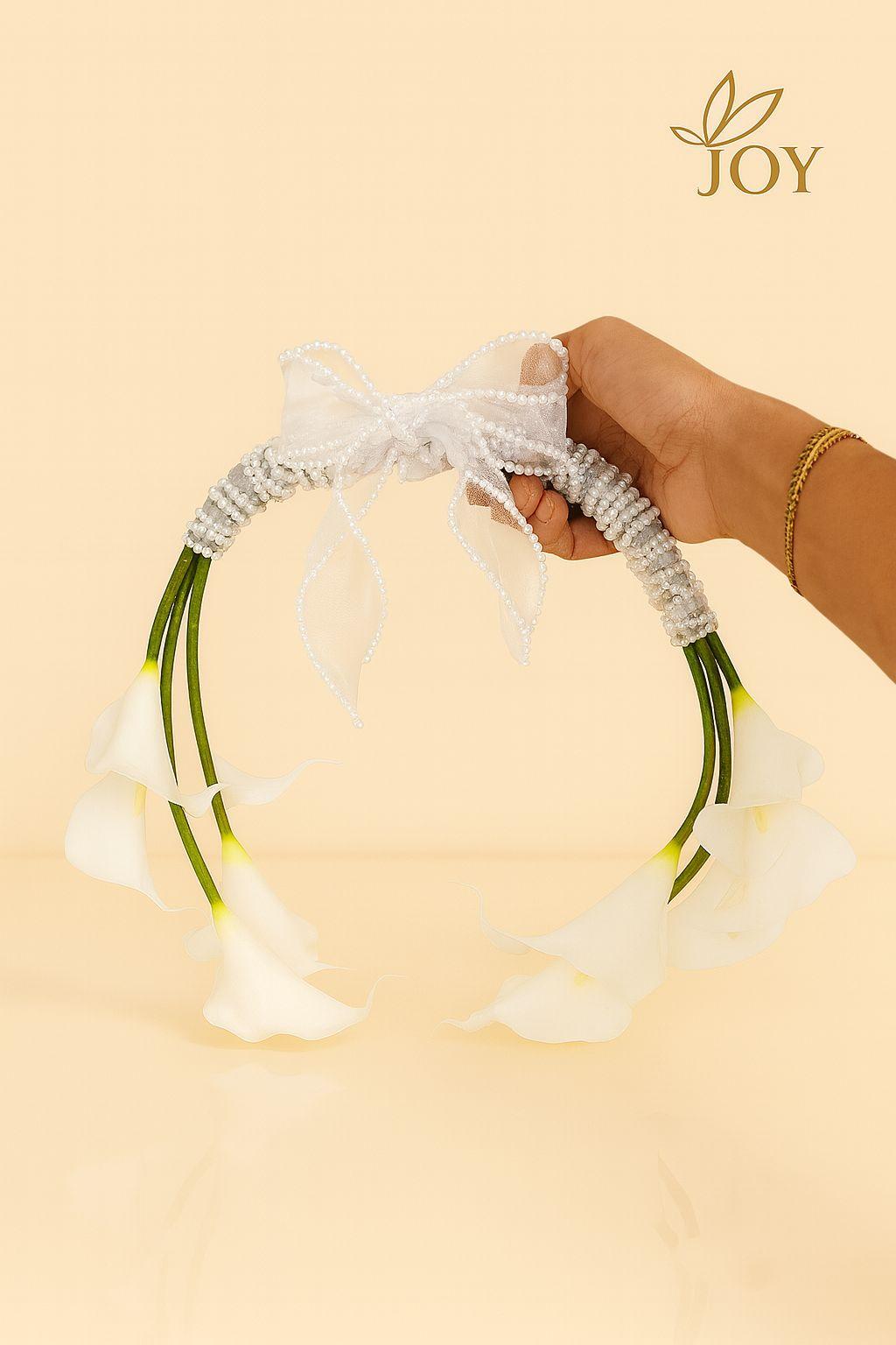 An elegant bouquet of 8 white calla lilies, adorned with beads and pearls, bringing a soft and royal simplicity for