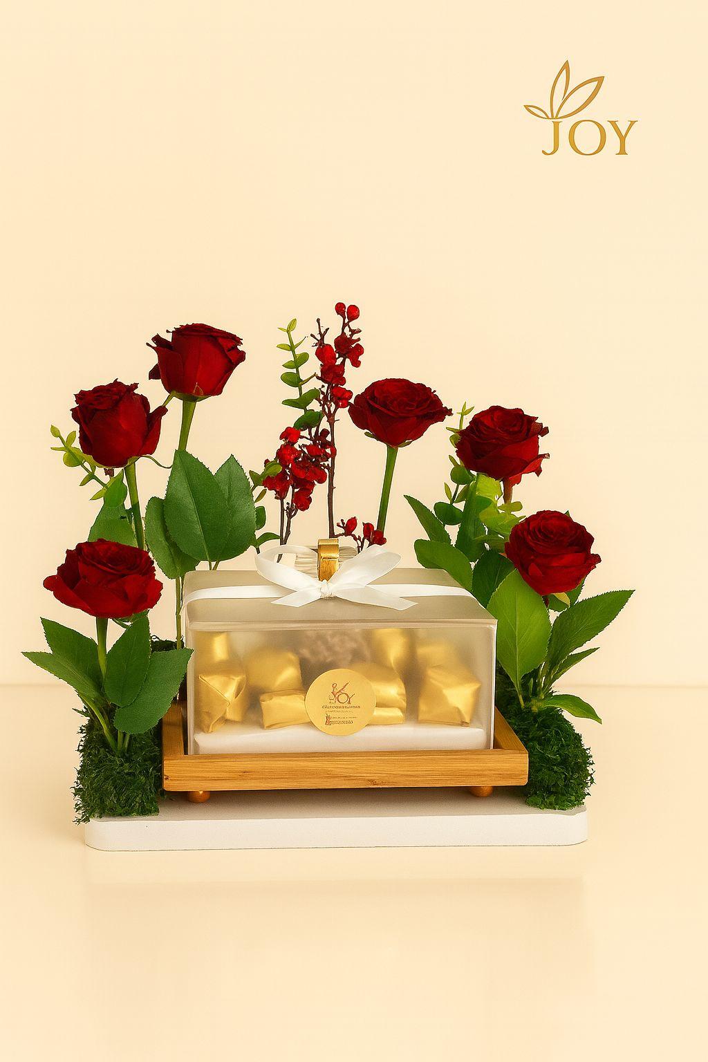 Red Roses with Mixed Chocolate Box (½ KG ) An elegant arrangement that combines the timeless beauty of red roses with a sophisticated box filled with ½ kilo of premium assorted chocolates. A perfect gift for special occasions such as Valentine’s Day or anniversaries, expressing love and luxury with a sweet touch .